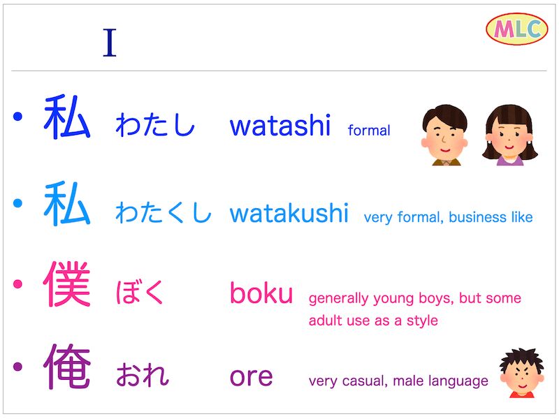 | 俺 | おれ | ore | Very casual (Male) | Informal; used by men with close friends or in relaxed settings. Not polite. |