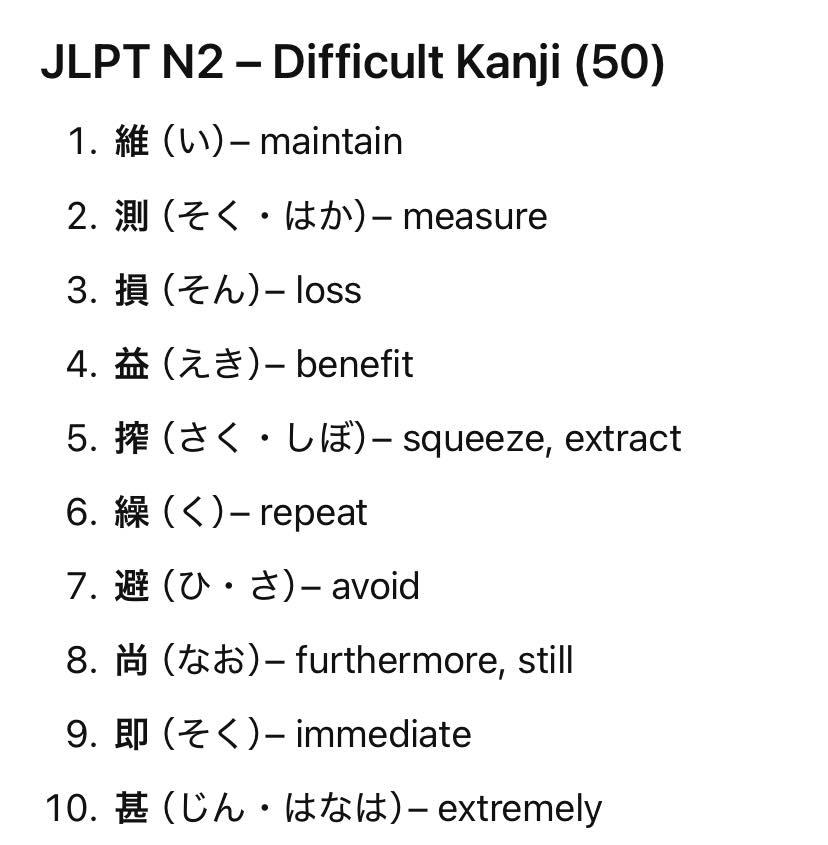 JLPT N2 – Difficult Kanji JLPT N2 – Difficult Kanji Related Post: Mimi Kara N2 Vocabulary (Units 1-13) JLPT N2 Kanji List PDF 2026-02-02 Yuri Share