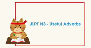JLPT N3 Adverbs List JLPT N3 – Useful Adverbs No. Kanji Hiragana/Katakana Romaji Meaning 1 良く よく yoku often 2 大抵 たいてい taitei usually 3 時々 ときどき tokidoki sometimes 4 しばしば shibashiba often 5 すぐ sugu immediately 6 とても totemo very 7 かなり kanari fairly / quite 8 随分 ずいぶん …