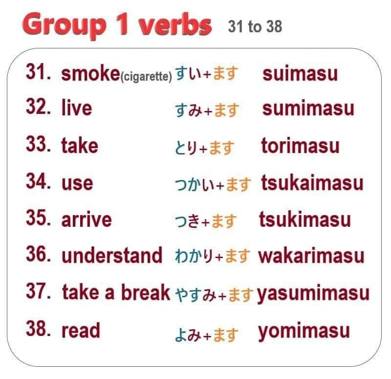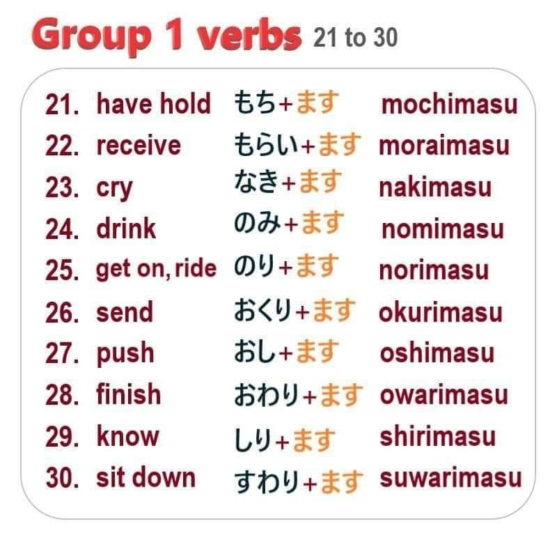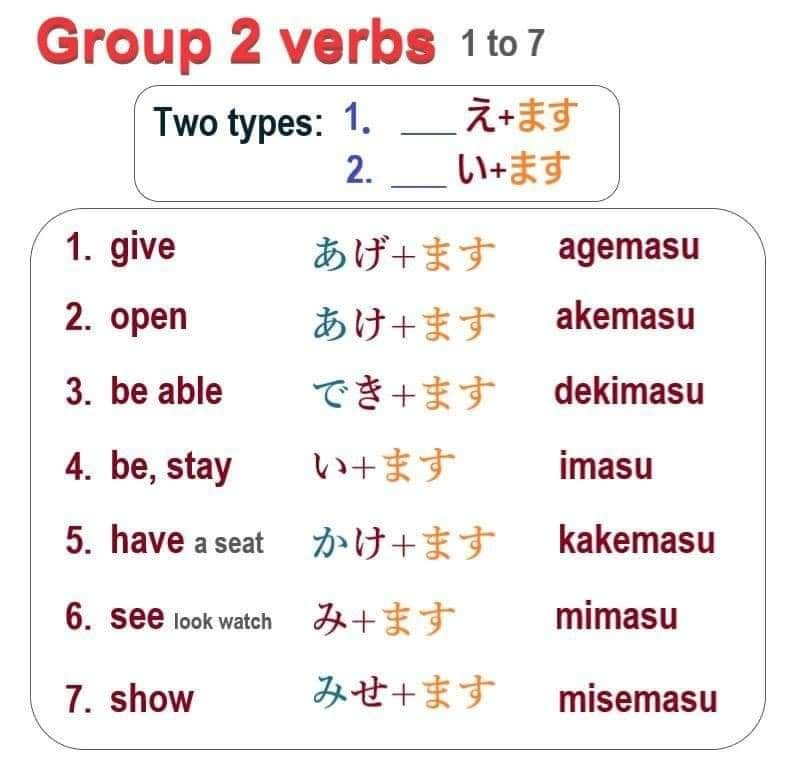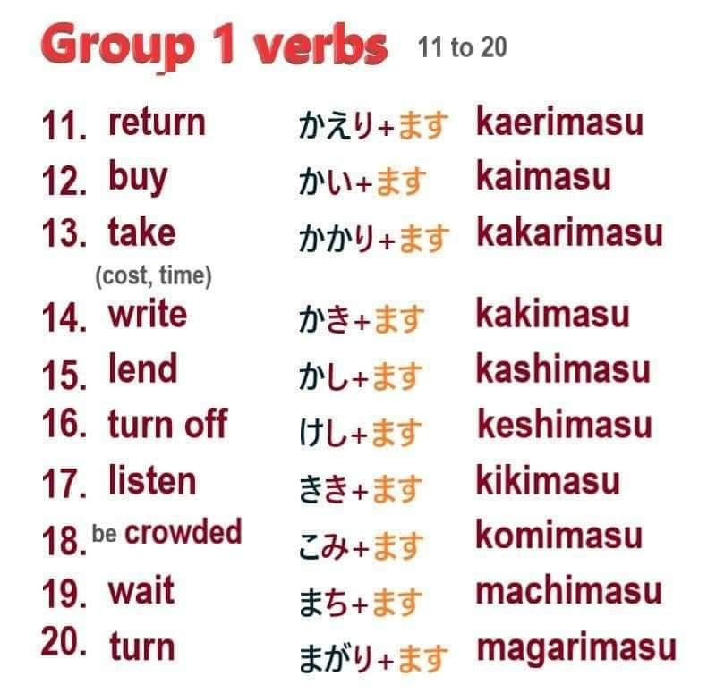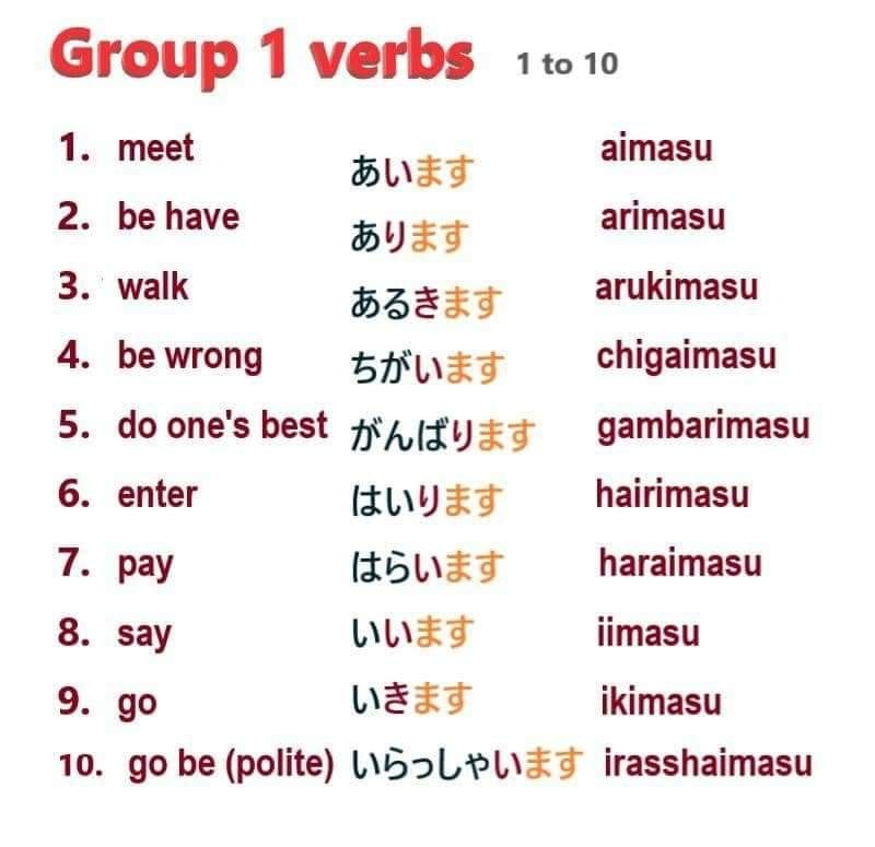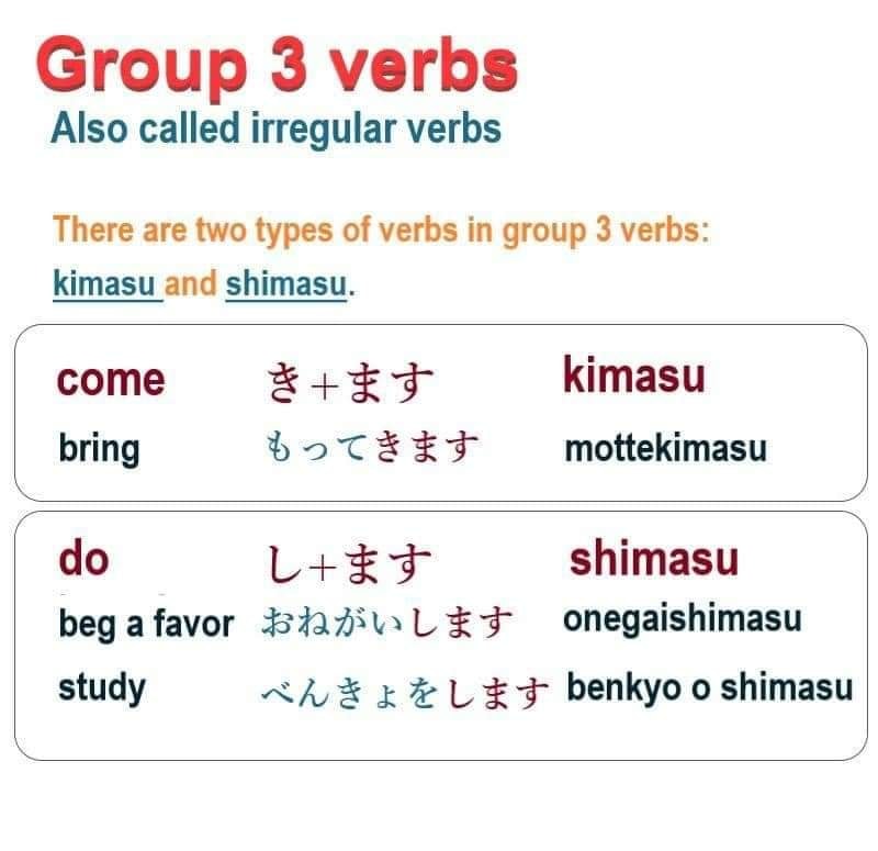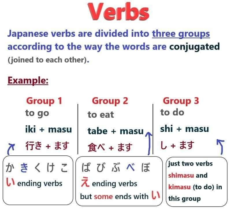 Japanese verbs are classified into three groups: Group 1 (-いる and – えるverbs), Group 2 (-る verbs) and lastly Group 3 (irregular verbs. All these three groups are differentiated by the ending of the verb.